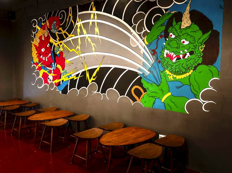 Això d'emportar-se un mateix la banda sonora a la cocteleria no és l'única proposta singular de Mugi. Disposats a animar les tardes de Barcelona i fomentar allò de prendre alguna cosa després de la feina, compten amb una carta dedicada al nomikai, una mena de vespreig japonès. En realitat, aquest nom es refereix a l'habit nipona de beure –normalment molt– amb els caps, però per sort aquí es pot eliminar la part tòxica de l'equació i, senzillament, prendre's un highball amb uns edamames picants a un preu molt ajustat, entre les 5 de la tarda i les nou de la nit.
