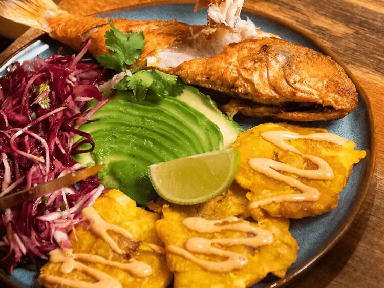 Però el més interessant és la seva aposta caribenya: destaquen els tostones playeros, el còctel de marisc Vuelve a la vida (un cosí germà proper del ceviche que se suposa té propietats afrodisíaques), el Rompecolchón (mescla de marisc, arepa fregida de blat de moro, ceba morada en conserva i llagostí fregit), l’empanada de pabellón margariteño (on la carn es substitueix per caçó) i la sopa de marisc Fosforera, amb daus de peix blanc, llagostí, calamar, musclos i cloïsses. Alguns d’aquests plats també tenen versió vegana; només cal preguntar.