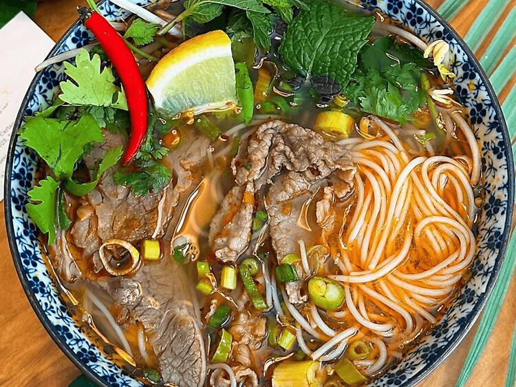 Més enllà dels imprescindibles —el pho en totes les seves versions (pollastre, vedella, vegà o l’especial amb quatre talls diferents de vedella), el bún bò hue, típic de Hue, amb fideus gruixuts, vedella, herba llimona i pasta de gambes, i el sempre temptador entrepà banh mi (de porc o pollastre a la planxa; vegà amb tofu, alvocat i xampinyons; o el clàssic amb porc, paté i ou)— aquí podeu viatjar a Hanoi amb plats com els rotllets fregits, daurats i cruixents per fora i farcits de carn de porc picada, bolets orella de fusta, fideus de vidre i verdures. També el bun cha, amb fideus i mandonguilles de porc a la brasa, o el peix a la graella amb salsa de cúrcuma i vermicelli.