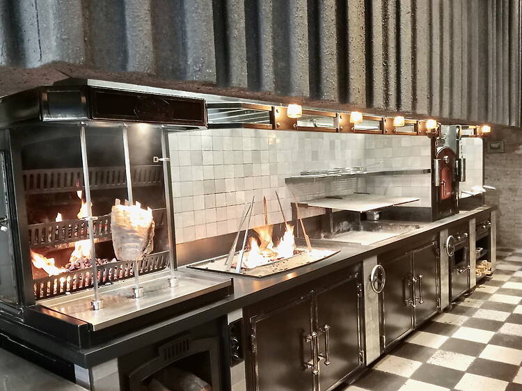 El senyal d’identitat d'un restaurant compromès amb l'excel·lència pròpia dels millors és l'ús del foc de carbó i llenya amb broquetes, una tècnica poc vista a Barcelona: rosteixen –costella de vedella o picantó, per exemple– a l’estaca amb foc directe i peces que eviten greix al foc, preservant així el sabor pur de la peça. No tot és brasa: el xef Ramon Panés toca el producte de temporada i el xup-xup en plats sumptuosos com els rovellons a la brasa saltats amb sobrassada o una tripa i capipota amb piparra brutals, amb xoriço i cecina de bou de veritat. I tampoc tot és carn: us podeu cruspir una broqueta de sardines que arriba directament de la brasa al plat, o ventresca de tonyina a la brasa amb sofregit de piparres